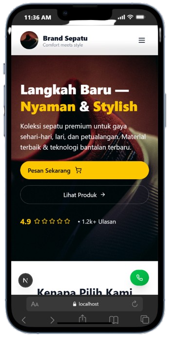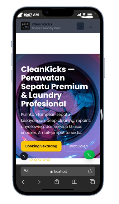 Clean Sepatu adalah template landing page profesional yang dirancang khusus untuk bisnis jasa cuci sepatu, repaint, deep clean, dan treatment leather. Dibuat untuk membantu brand kamu terlihat lebih premium, meningkatkan kepercayaan, dan memaksimalkan konversi pelanggan secara online. Cocok untuk UMKM laundry sepatu, workshop sneakers, hingga brand custom sepatu.